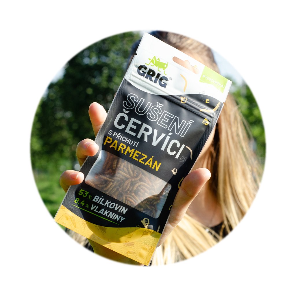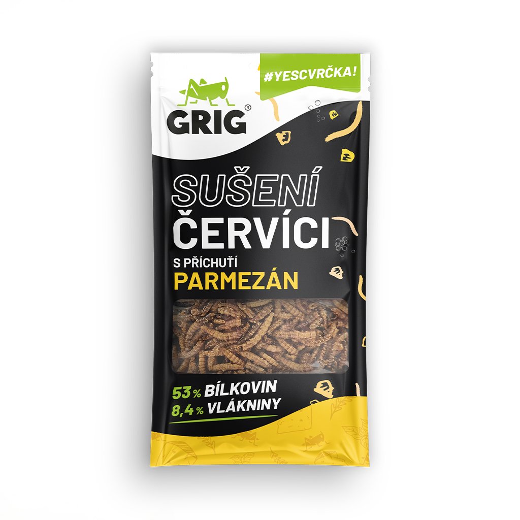 1× Grig Červíci Parmezán 13 g – Gurmánská kombinace jemného parmezánu a křupavých červíků, kterou si hned všichni zamilují!