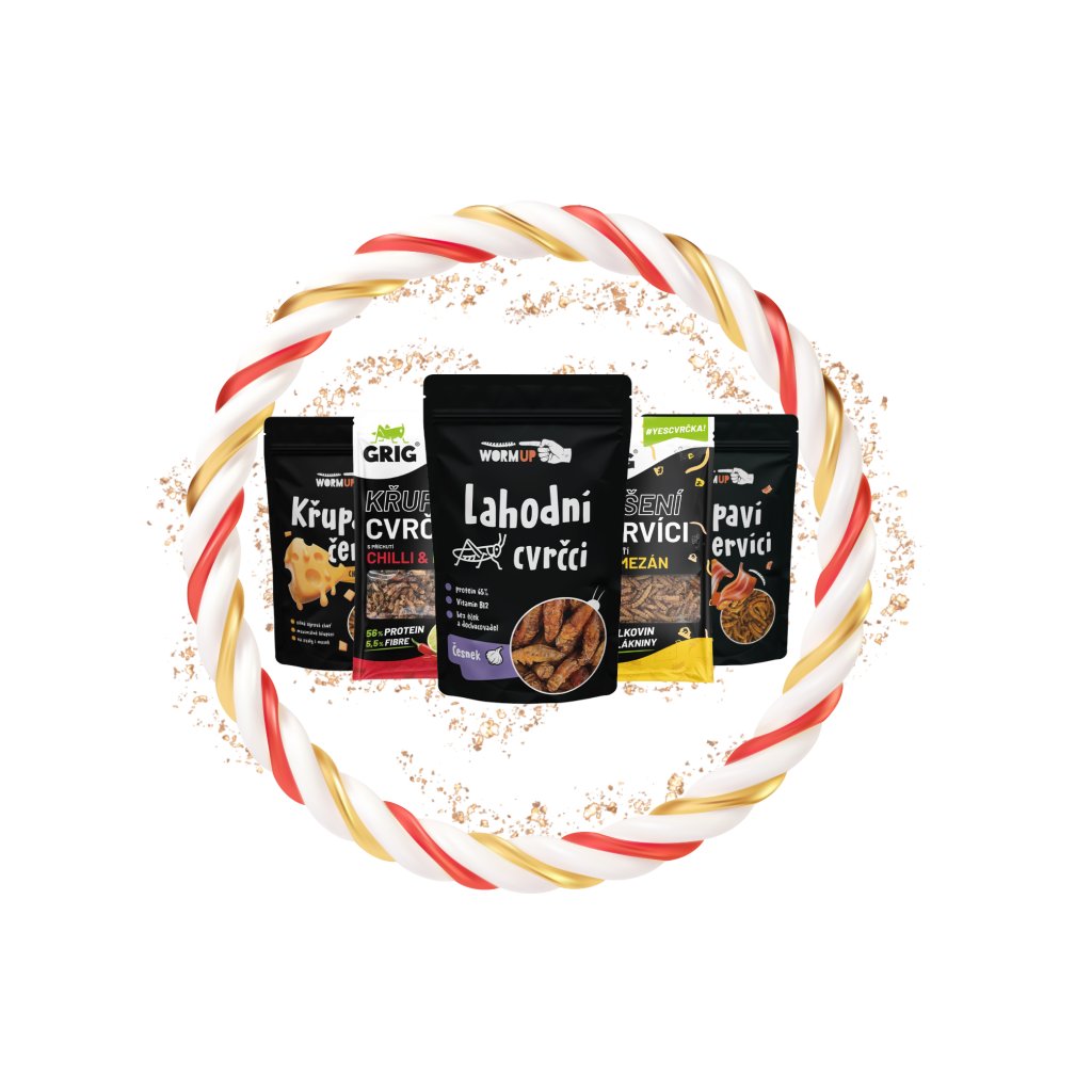 Dva české brandy, jedna vášeň pro neotřelé nápady a chutě! Tento balíček vznikl spojením značek Grig a WormUP, které propojuje láska k inovativním snackům z jedlého hmyzu. Společně jsme vytvořili unikátní kolekci, která tě vezme na křupavou vánoční jízdu plnou originálních kombinací chutí – od sýrové klasiky až po výraznější chuťové tóny.