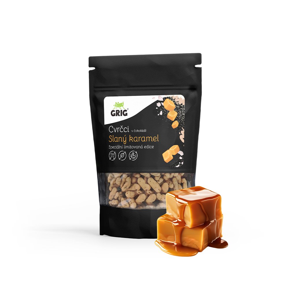 1× Grig Cvrčci Slaný karamel 35 g– Sladká a jemně karamelová delikatesa, která tě mile překvapí svou kombinací chutí.